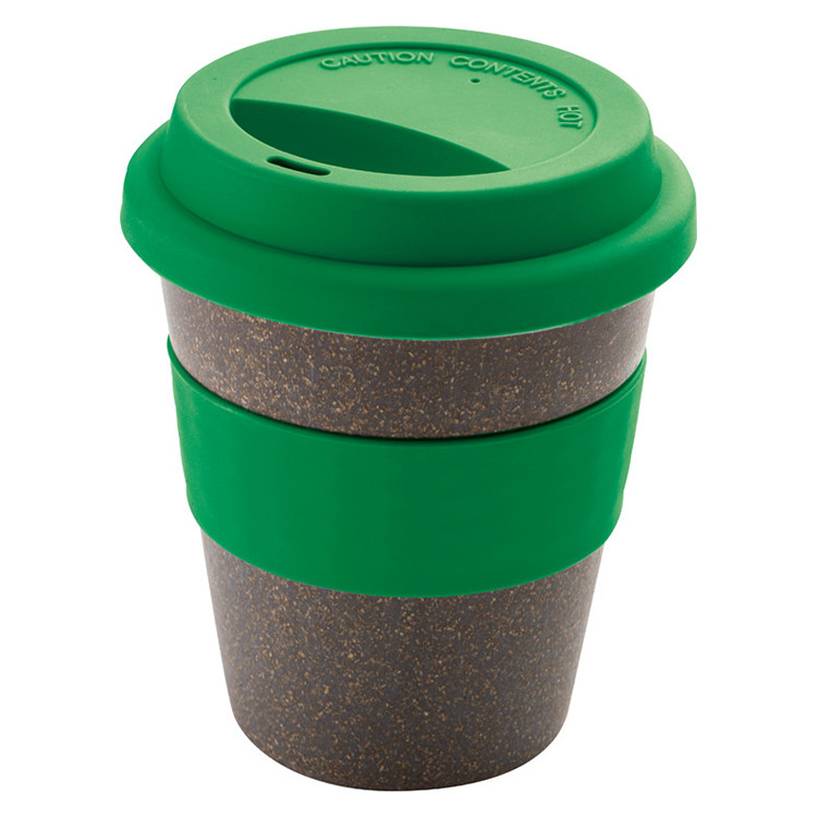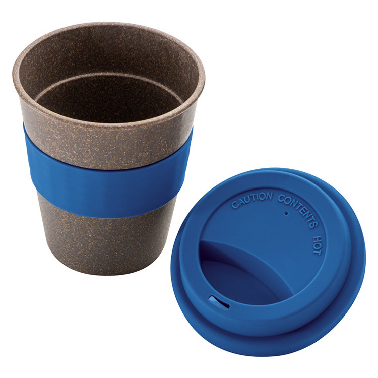 250 ml mug made of bamboo fiber, with silicone lid and grip. Dishwasher safe; a long-lasting and sustainable promotional item.