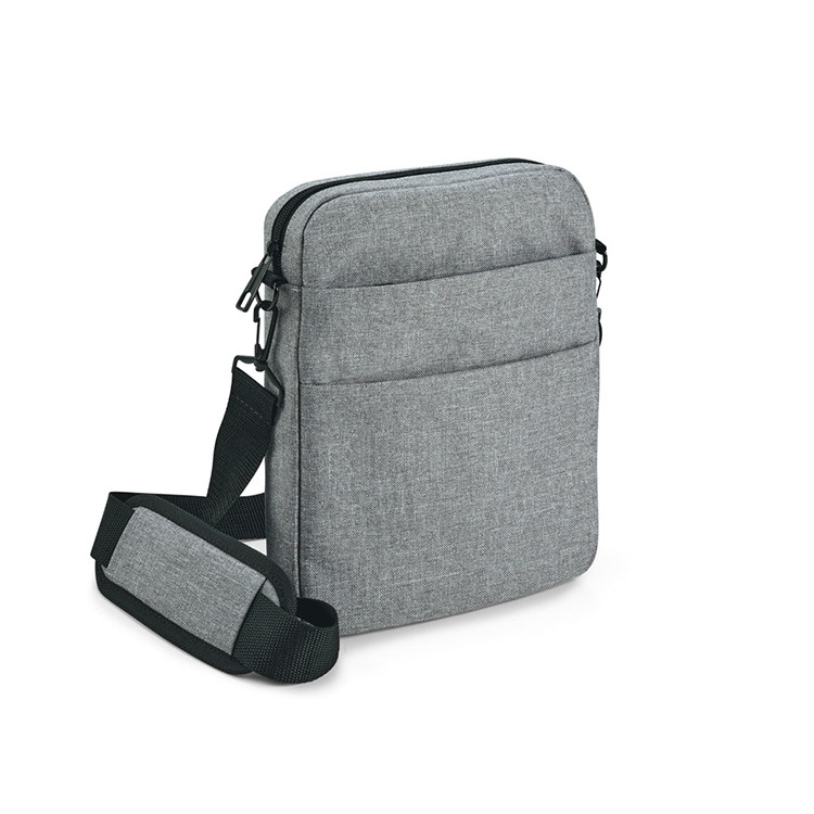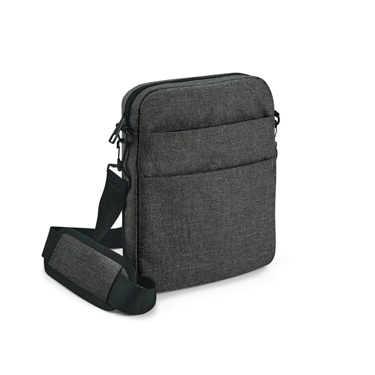Shoulder bag. 600D high density. Compartment with cushioned partition up to 9.7” tablet. Interior lined and cushioned. With front pocket. Adjustable shoulder strap with padded reinforcement.