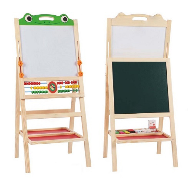 Double-sided combination board with white, smooth surface on one side – suitable for writing with a board marker and black chalk writing board on the other side. The board has a abacus and a clock with moving arrows in different colors – everything for the little student! At the bottom is a comfortable stand for markers, chalk, wiping sponge and various accessories.