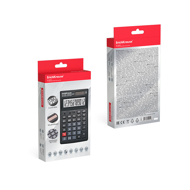 Electronic calculator in a plastic case with 12-digits LCD display. Has a memory key. Optimal set of calculating functions allows to perform basic mathematical operations, calculate percentages, retail margin, extract the square root, summarize the operations performed and memorize the intermediate result. Convenient keyboard is equipped with buttons of “00” zero and backspace key. Has both rounding-off selector and decimal point selector. Solar power element can be charged both from direct sunlight and office ceiling lights, helping to save a charge of an alkaline battery. Power supply of a calculator turns off automatically if the device is not used for 7 minutes.