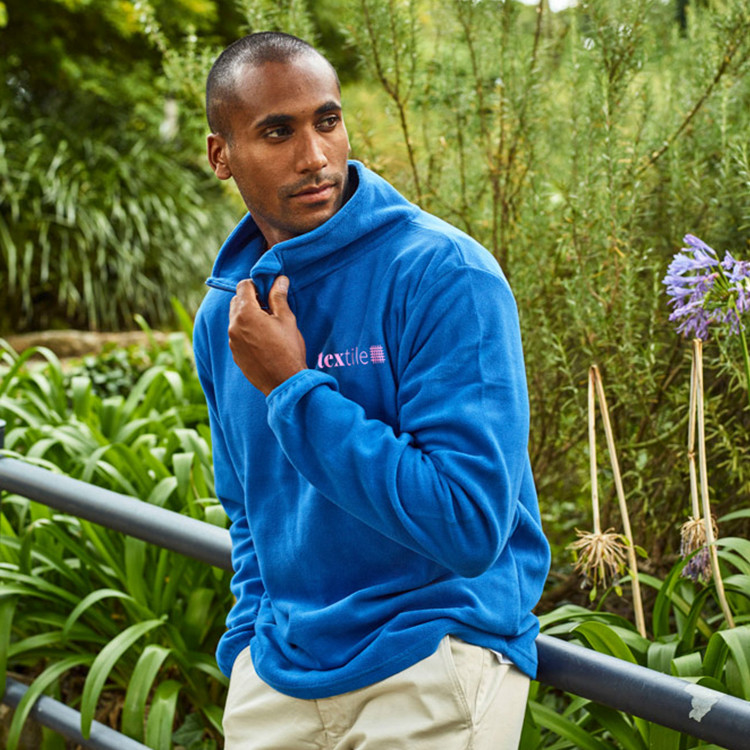 100% polyester unisex fleece (260 g/m²). With 1/4 zip closure. Elastic band on sleeves.