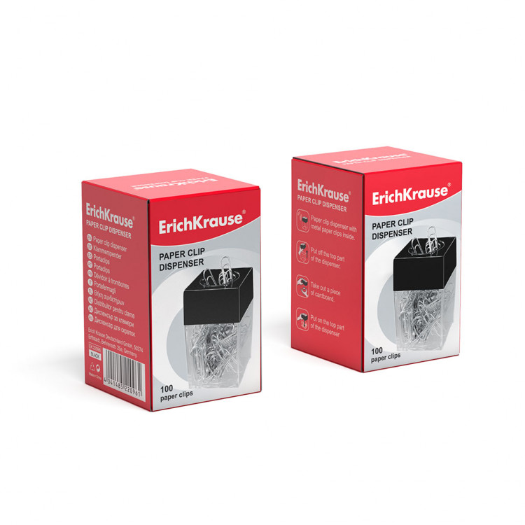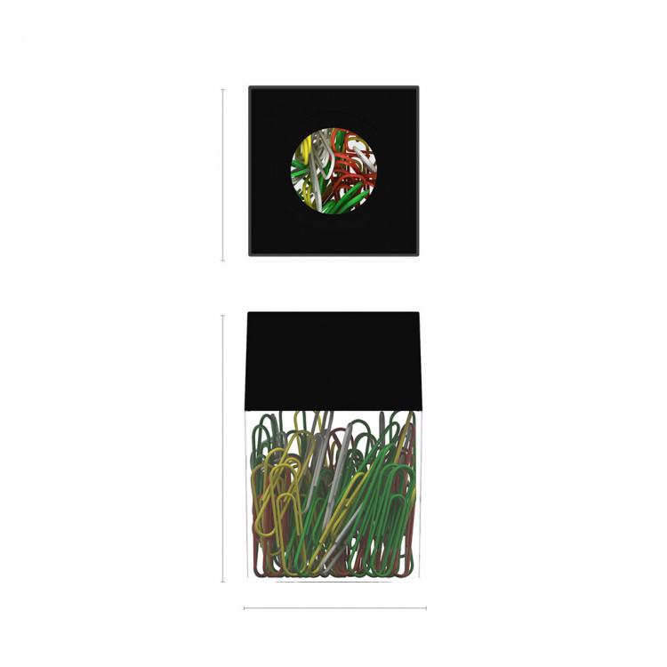 Compact plastic paper clip dispenser with a magnet preventing dispersal of paper clips. The set includes 100 zinc plated paper clips.