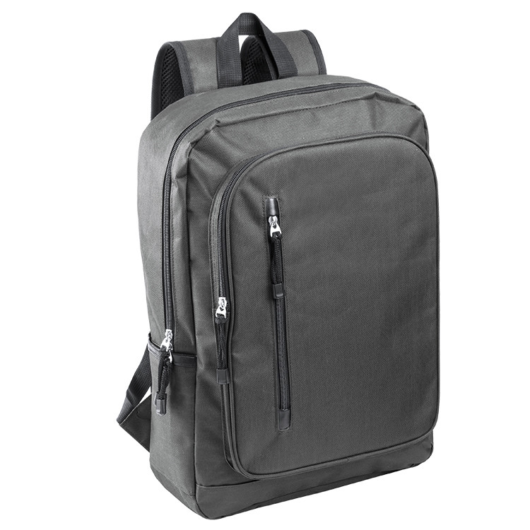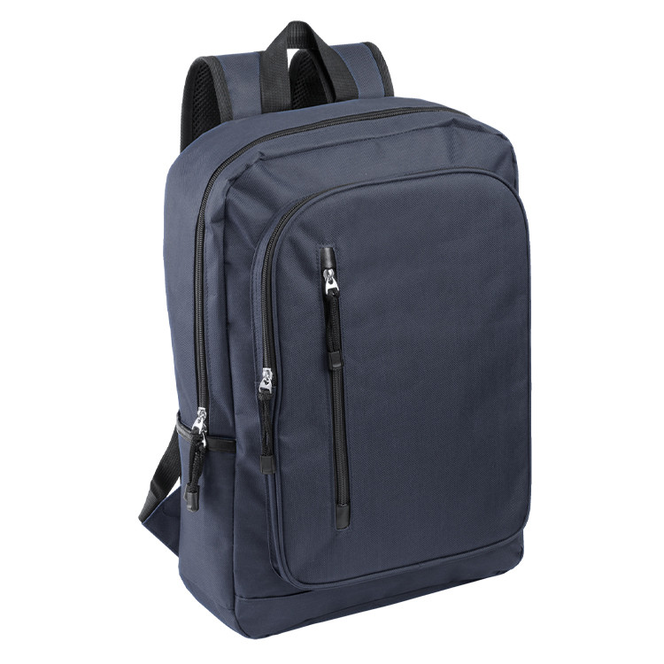 Backpack with multiple zipped compartments, padded laptop pocket (15″) and adjustable straps. 600D polyester.