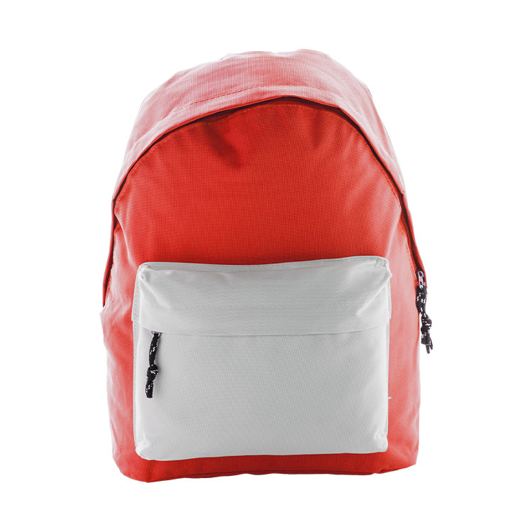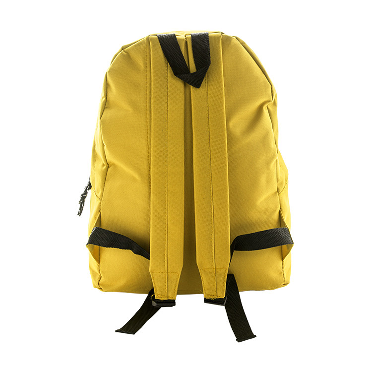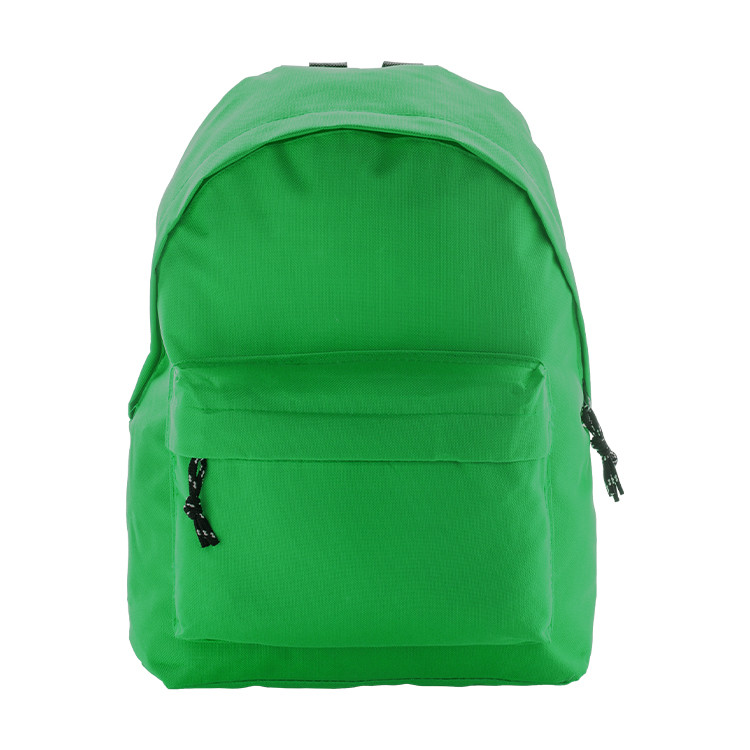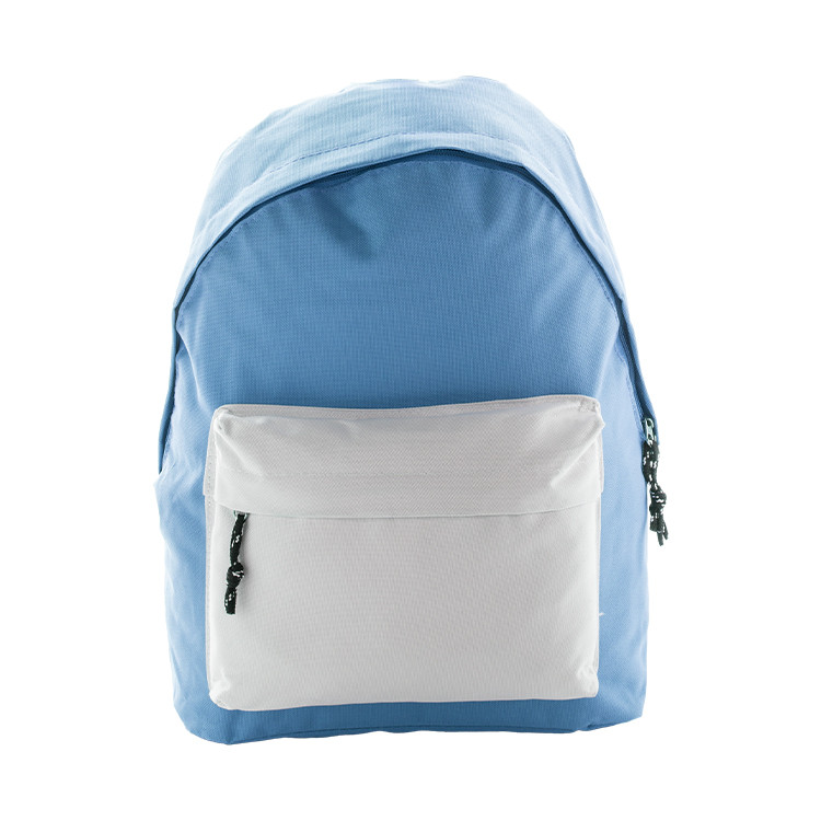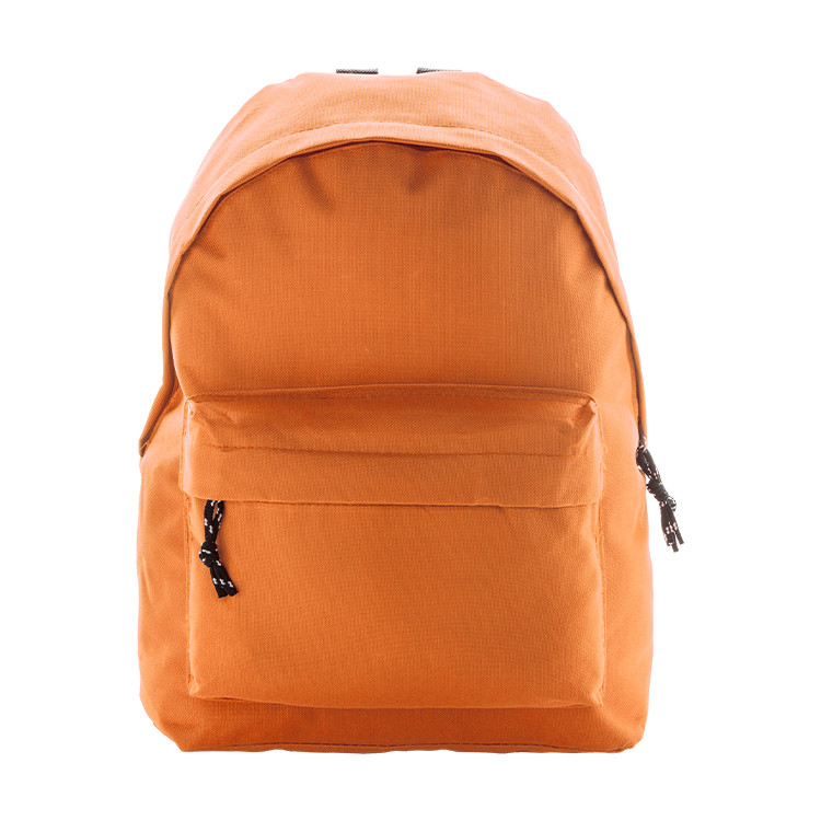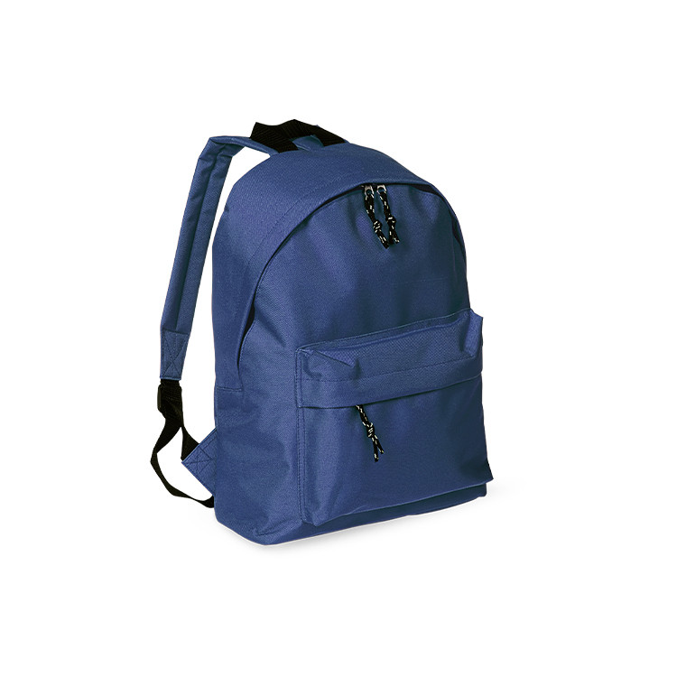 Backpack with zipped front pocket, padded back and shoulder straps. 600D polyester.