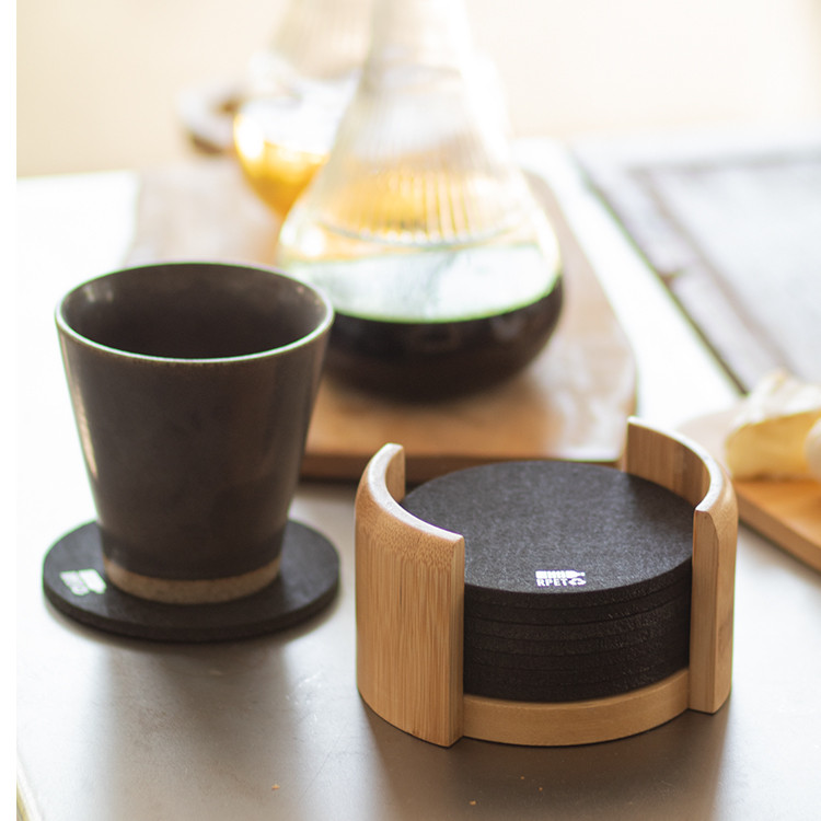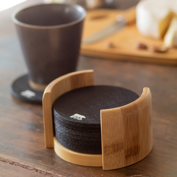 10 pc RPET felt coaster set in bamboo desk holder. With distinctive RPET logo on each coaster.