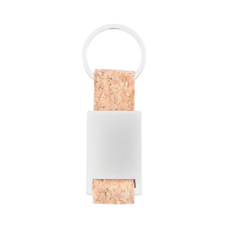Rectangular metal keyring with natural cork strap and metal ring.