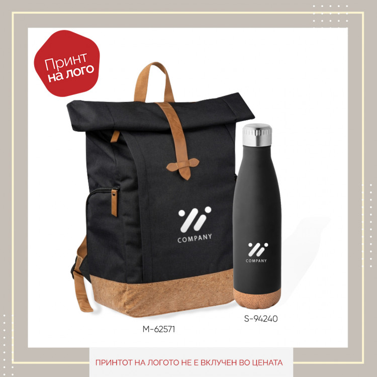 The gift set 16 is the perfect choice for a colleague, client, or friend, combining a stylish eco backpack with a cork base and a metal thermos with a 500 ml cork. The backpack with dimensions of 390x505x160 mm is durable and spaciously designed, which makes it comfortable for everyday wear. The thermos is made of metal, while the cork base adds a unique natural look that sets it apart from standard designs. This set can be personalized, adding a personal touch, and making it the perfect gift for a variety of occasions.