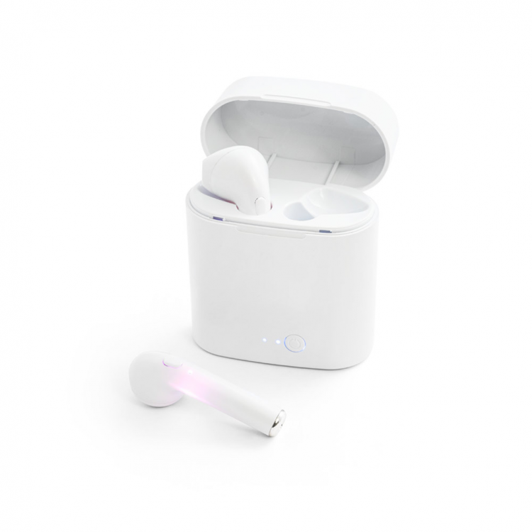 True Wireless ABS earphones with microphone and charging box of 250 mah. Autonomy up to 1.5h, frequency 20Hz-20KHz, 98 dB and impedance of 32Ω. Each earphone has a multifunction button. USB cable to charge. Supplied in a gift box. Headphone: 47 x 19 x 8 mm | Box: 55 x 64 x 26 mm