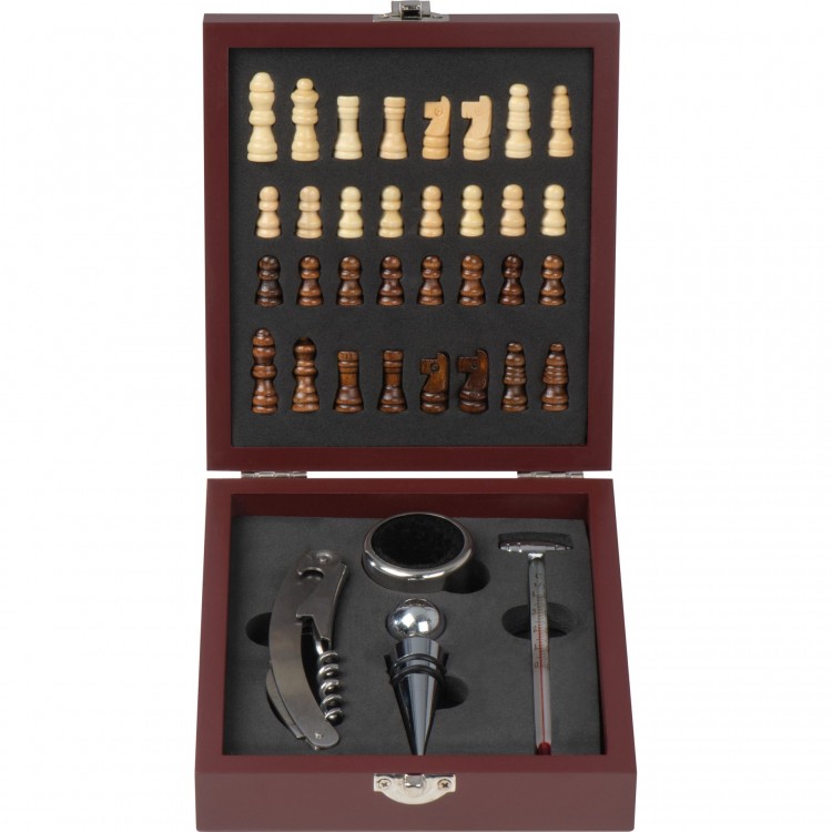 High-Quality Wooden Box: The wine set wooden box stands out for its quality and elegance. It serves not only as a storage space for wine accessories but also as a chess set with wooden pieces. This dual functionality makes the box a unique gift.