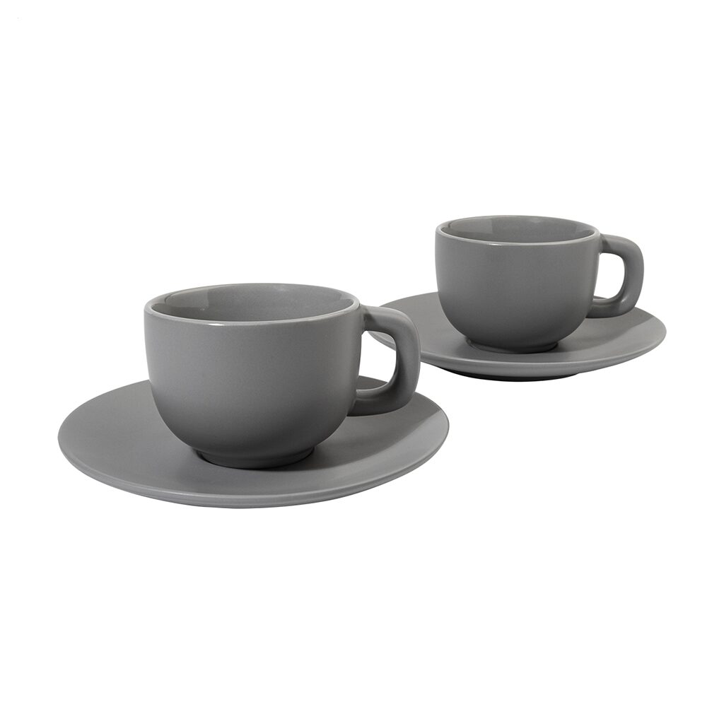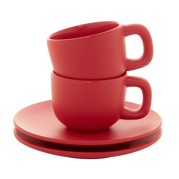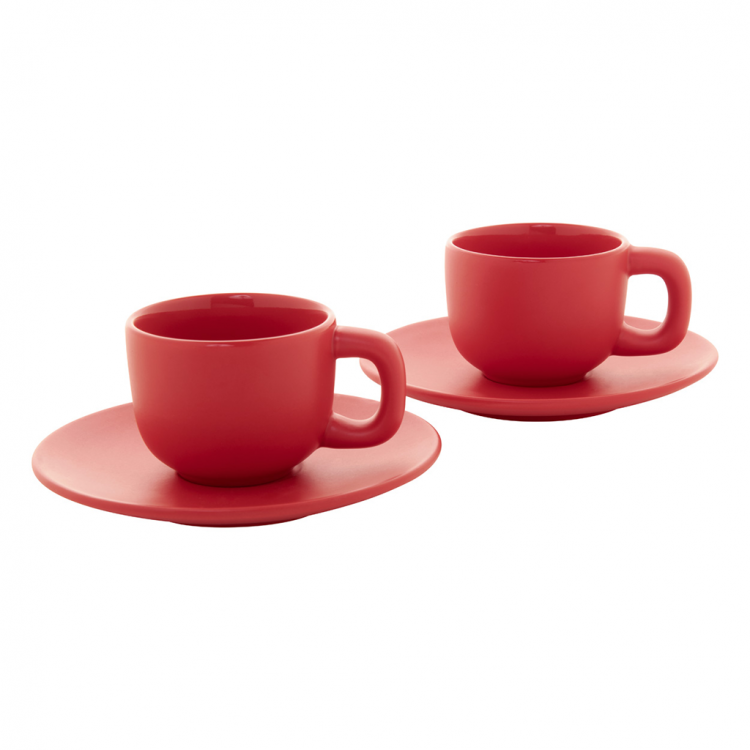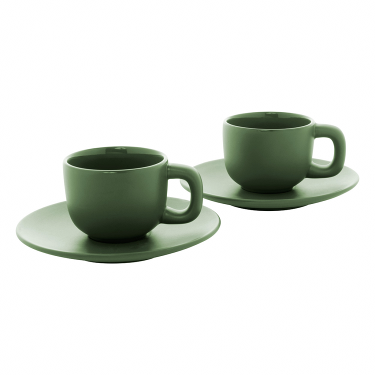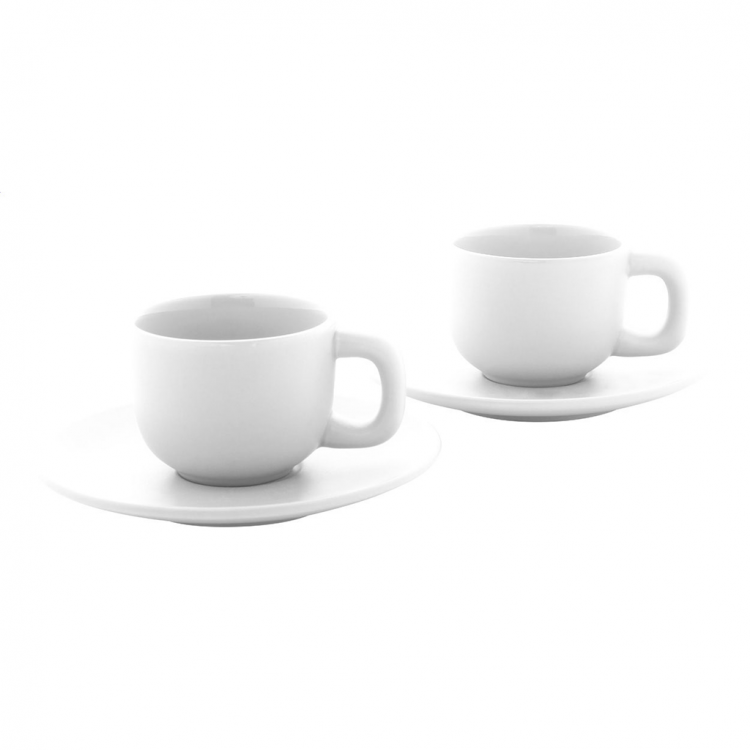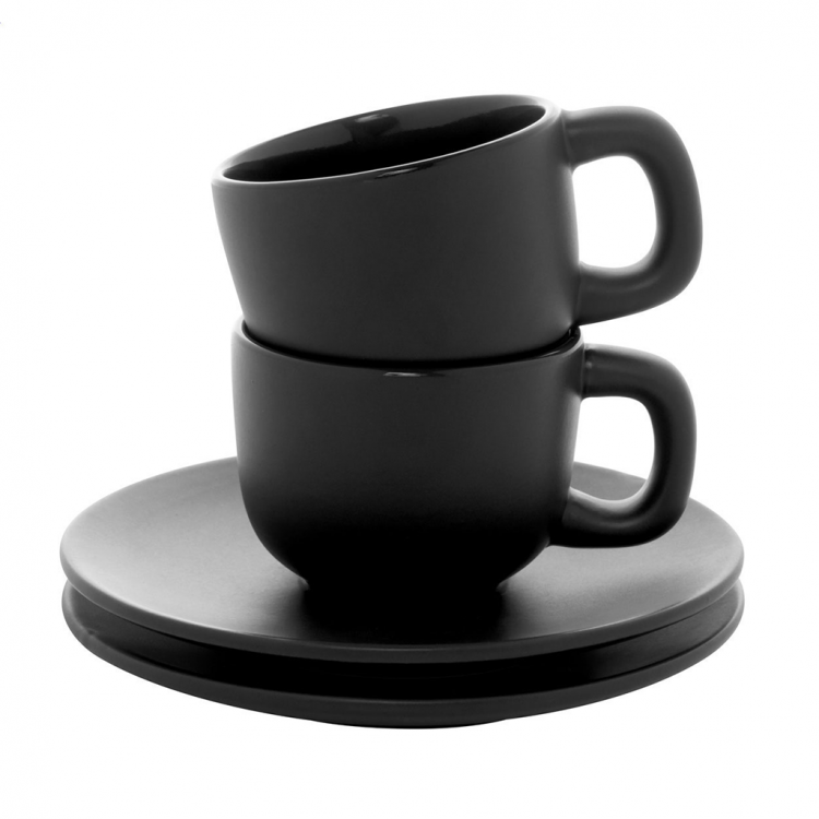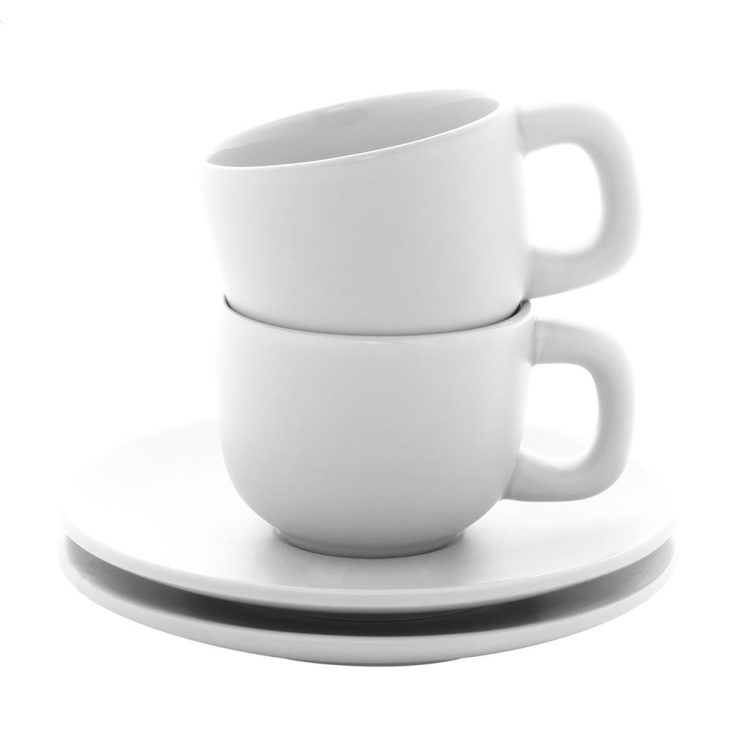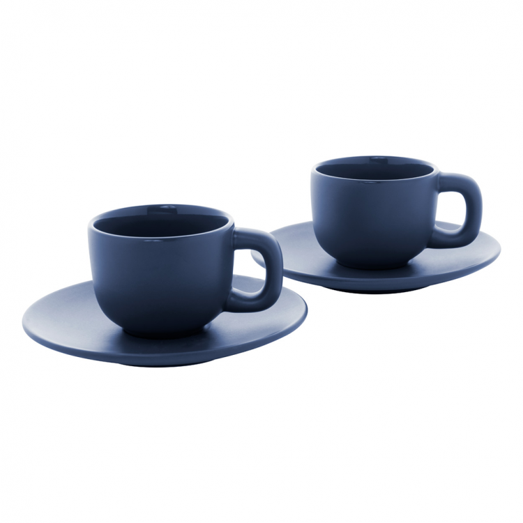 Елегантен сет од две керамички чаши за макијато со тацна. Достапен во повеќе бои, идеален за канцеларија, кафе-бар или подарок.