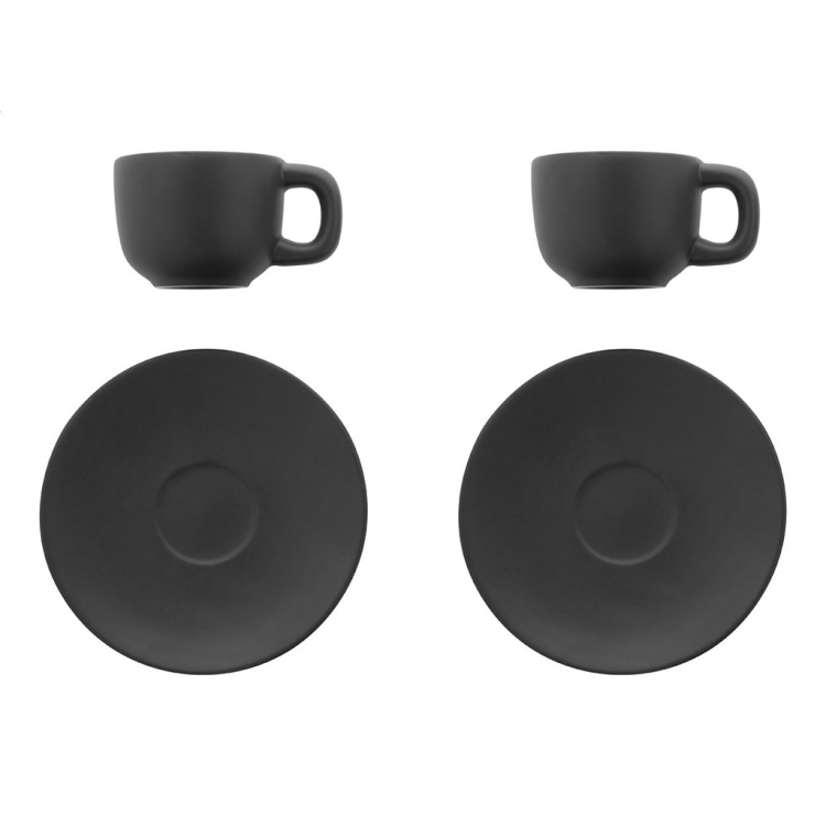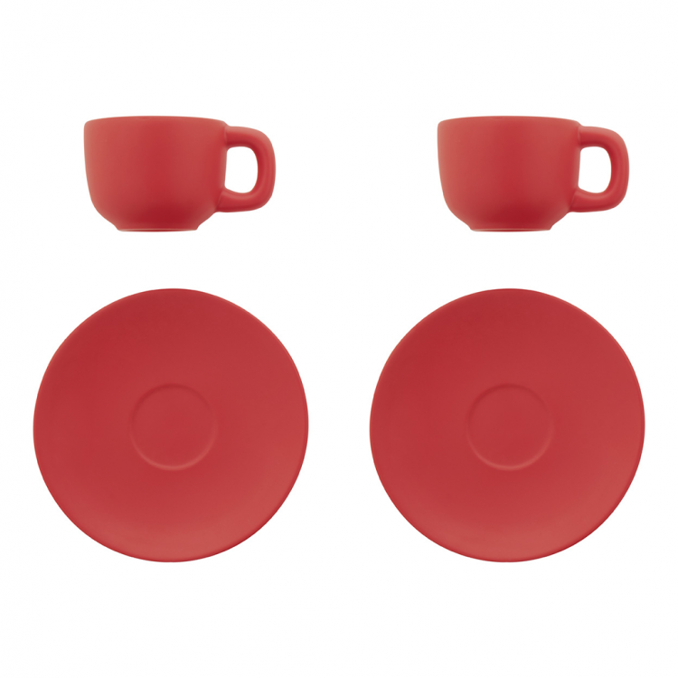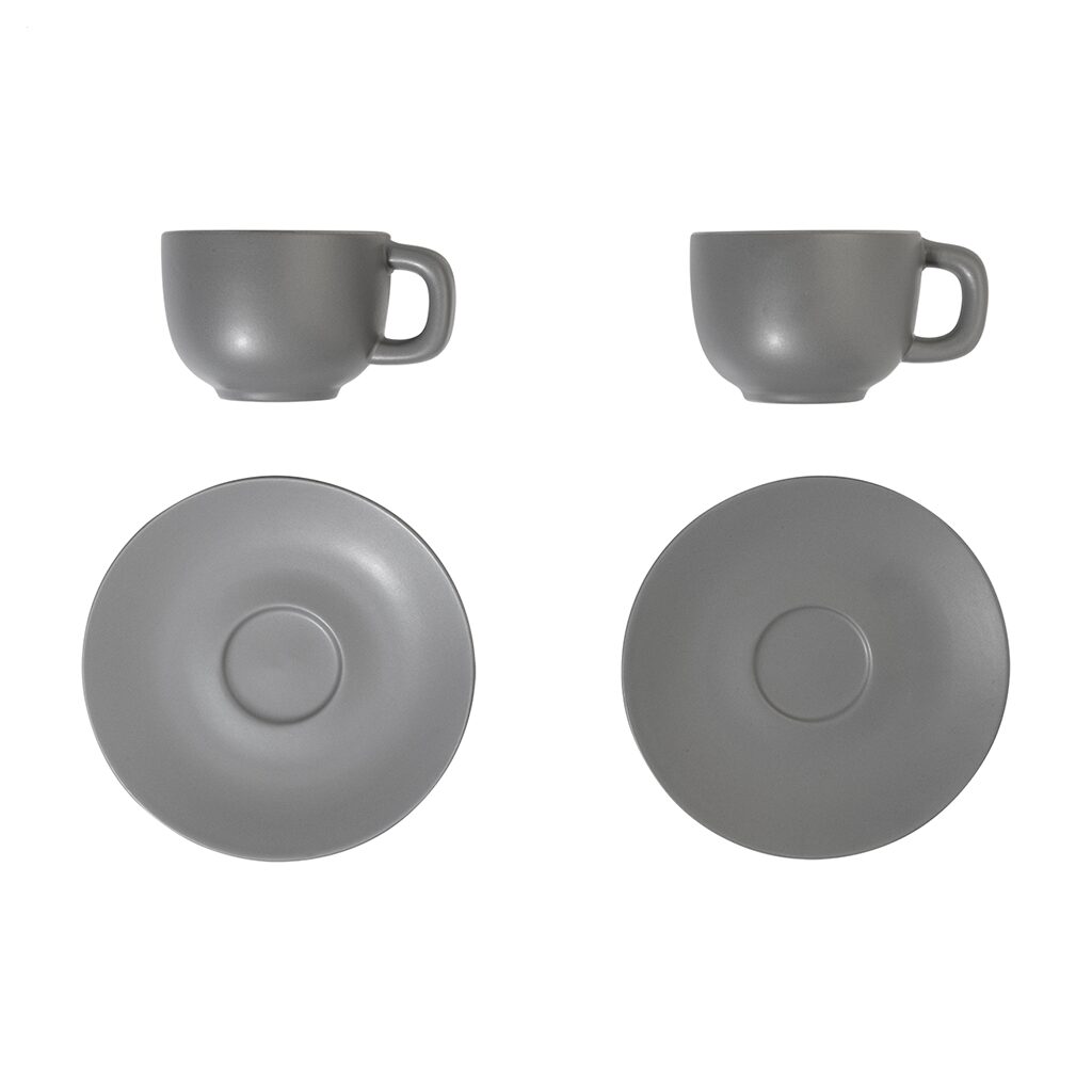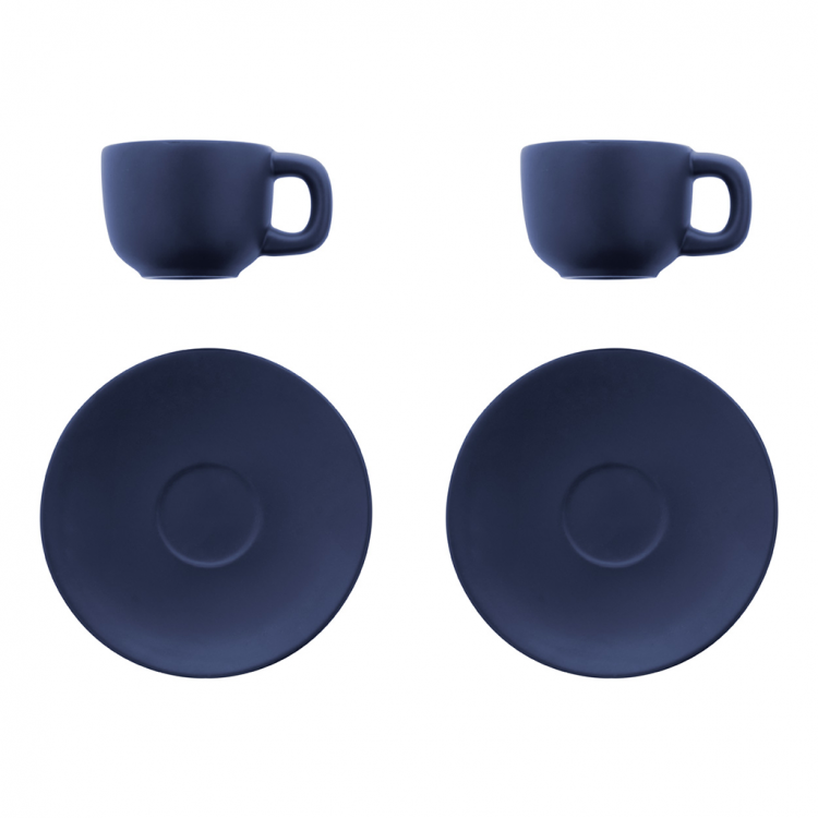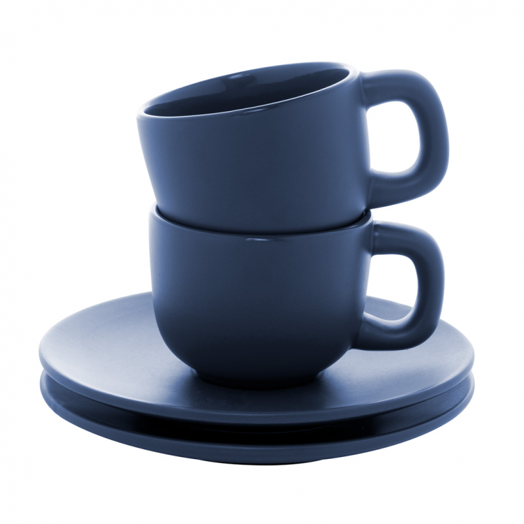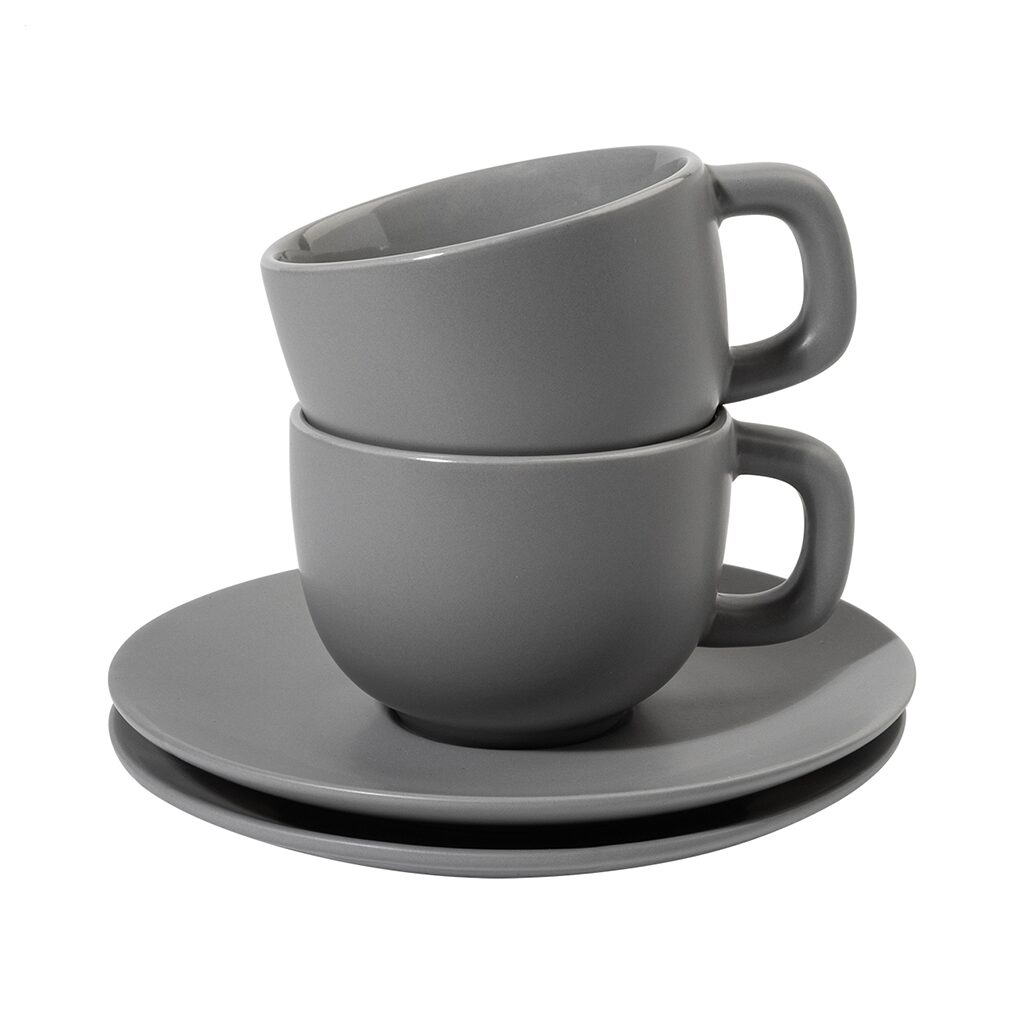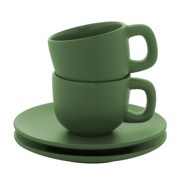 Елегантен сет од две керамички чаши за макијато со тацна. Достапен во повеќе бои, идеален за канцеларија, кафе-бар или подарок.