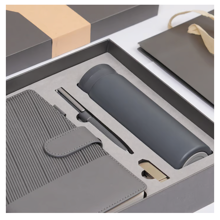 Premium business gift set including an A5 notebook, stainless steel bottle, pen, USB flash drive, and gift bag — all elegantly presented in a deluxe box.