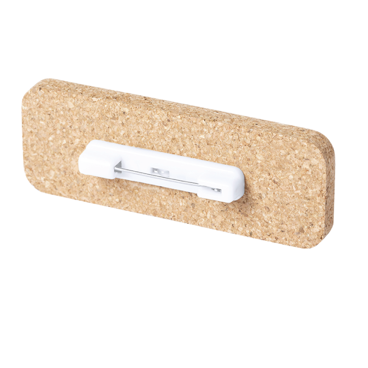Eco-friendly name badge made of natural cork, designed for sustainable branding and promotional use. The unique texture of cork gives each badge a natural and stylish appearance.