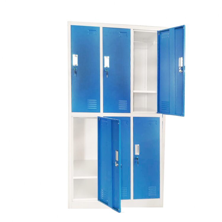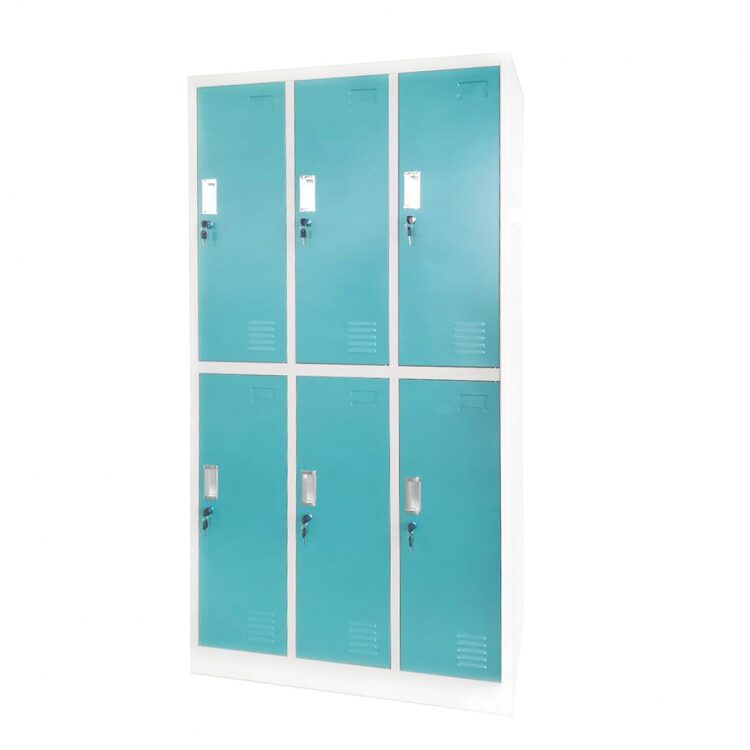 Durable metal locker with six compartments and six lockable doors. Ideal for offices, locker rooms, schools, and warehouses.