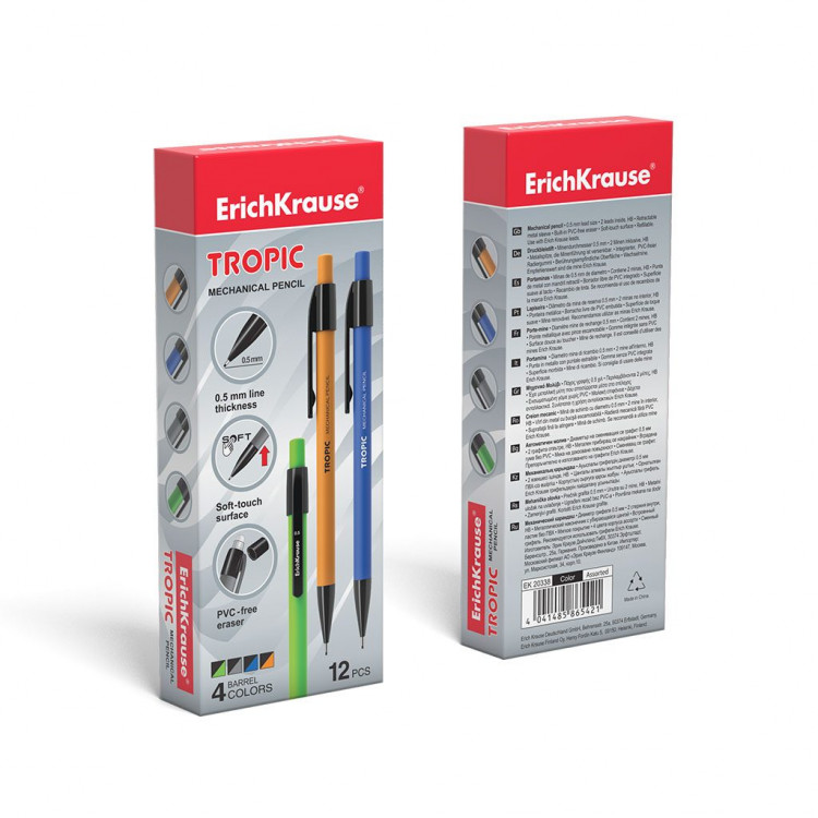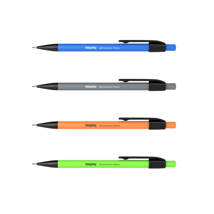 A mechanical round pencil with a retractable collet, an eraser, a cap and a convenient clip.