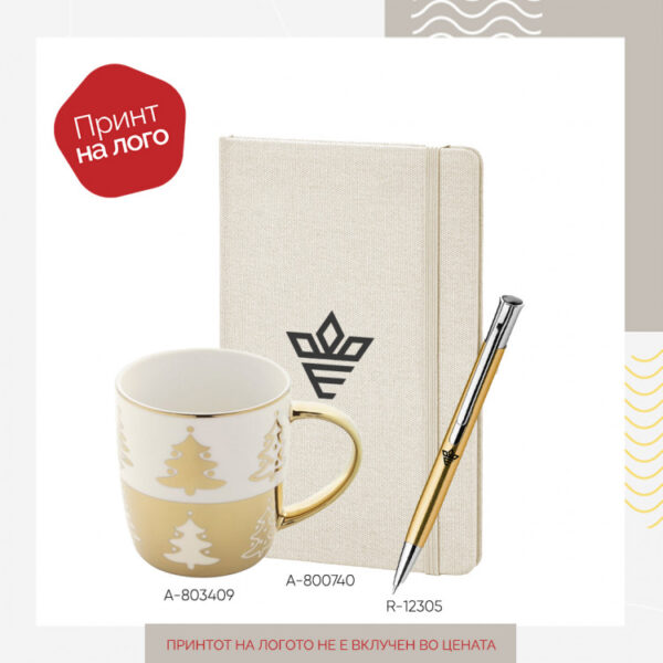 Елегантен подарок-сет со нотес A5, пенкало, визитар и приврзок. Совршен за корпоративни подароци, VIP клиенти и брендирање.
