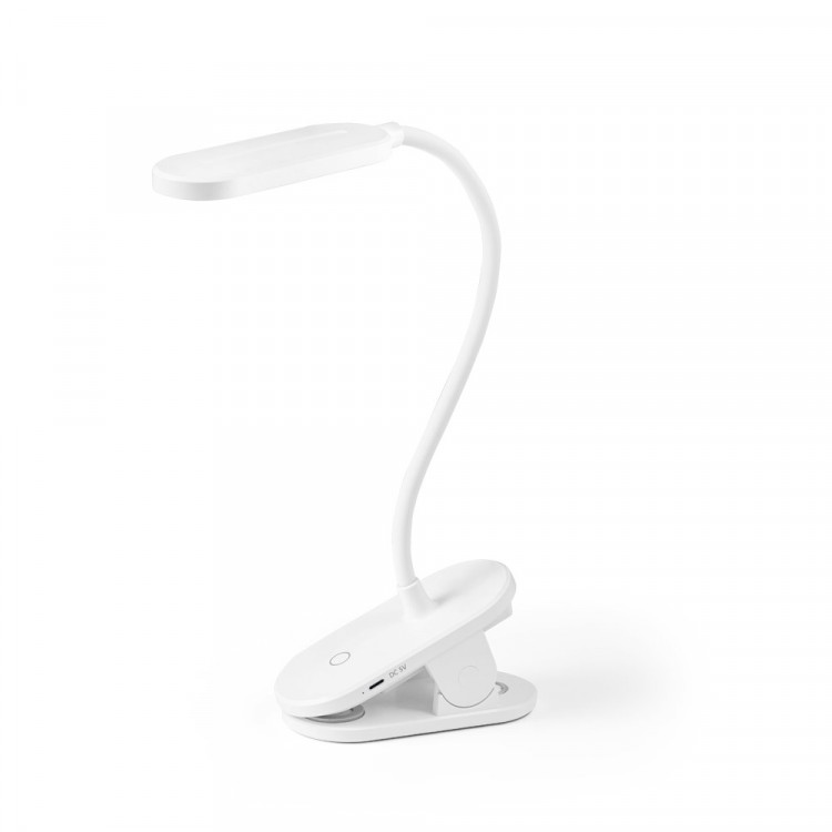 Portable table lamp in ABS (65% rABS) with 140 lumens and a clip to hold it to surfaces. The base is non-slip and the tube can be swivelled 360º to easily adjust the direction of the light. It has a built-in 1200 mAh lithium battery. It has an on/off switch with 3 brightness levels: high light (approximately 3 hours of use), medium light (approximately 7 hours of use) and low light (approximately 30 hours of use). Includes USB-C cable for recharging the battery. Supplied in a kraft paper gift box. 122 x 58 x 456 mm