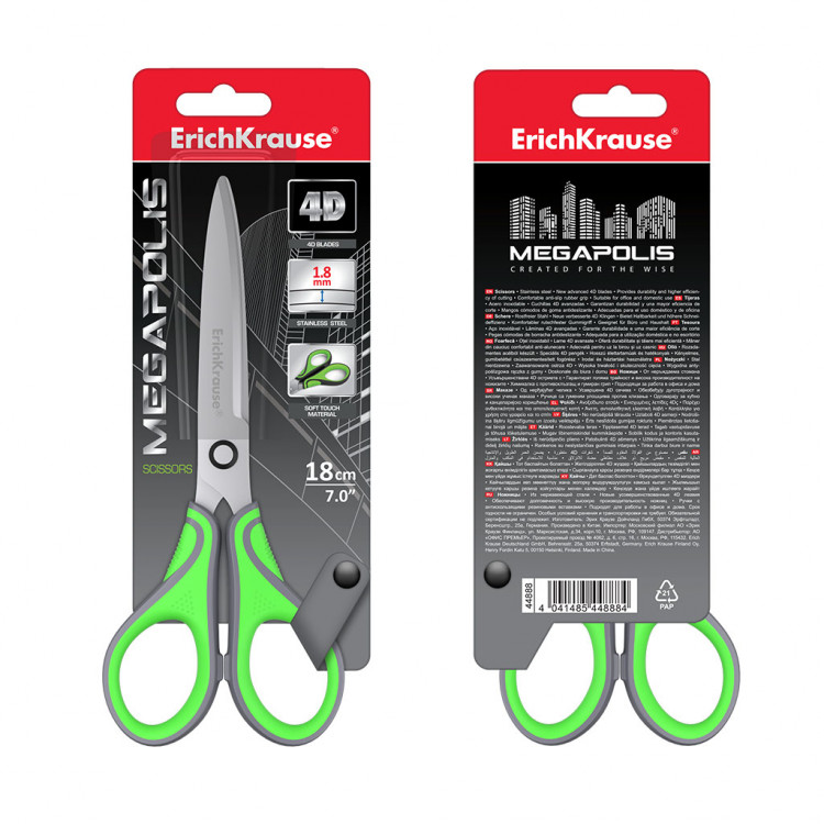 Ножици Erich Krause Megapolis 18см со 4D напредни сечила – прецизно и лесно сечење со минимален напор. Отпорни на корозија, со ергономска рачка, идеални за канцеларија, училиште и дома.