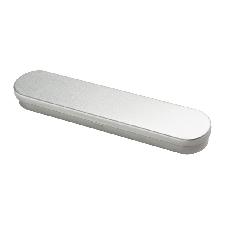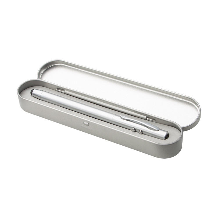 Multifunctional laser pointer with ballpoint and touch screen pen and LED light. In metal gift box with button cell batteries and blue refill.