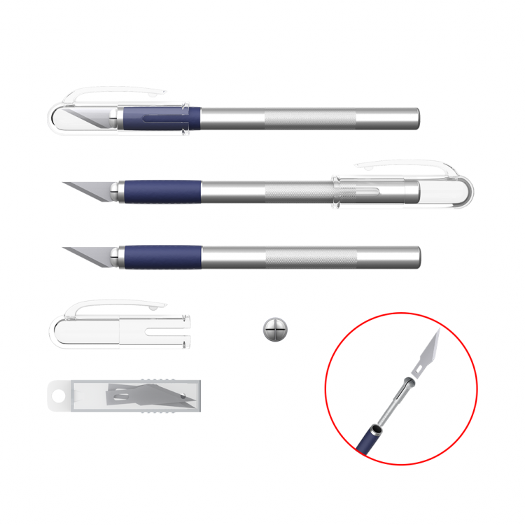 Precision knifes (scalpel) for neat and precise paper cuttings. Full metal body with rubber grip zone and protective cap. Supplied with a wear resistant steel blade with double sided sharpening.Corrosion resistant. Supplied with two spare blades in set.