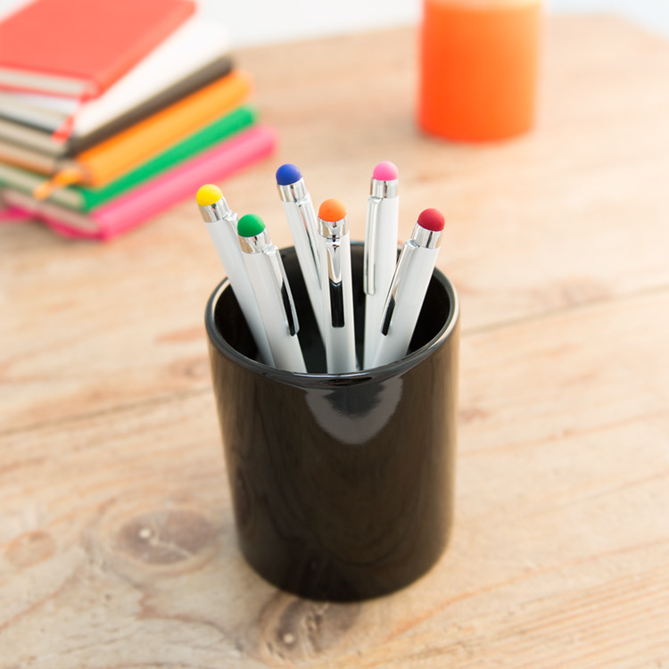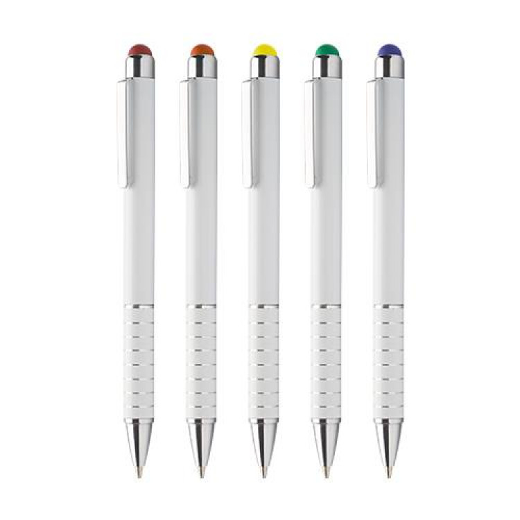 Модерно алуминиумско пенкало со бело тело и тач функција во боја, совршено за употреба со екрани на допир и секојдневно пишување. Со сино мастило и компактна форма, ова пенкало е идеално за промотивни кампањи и печатење на лого.