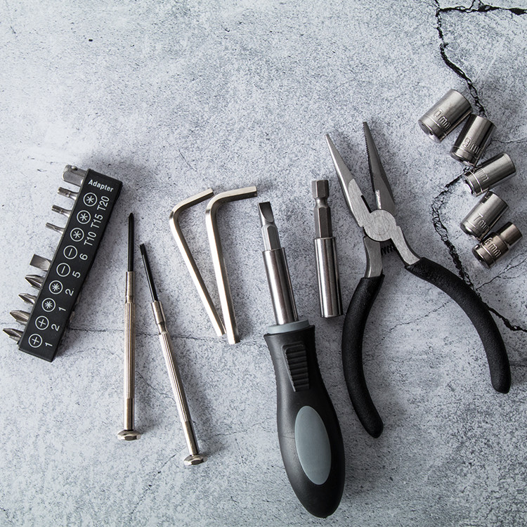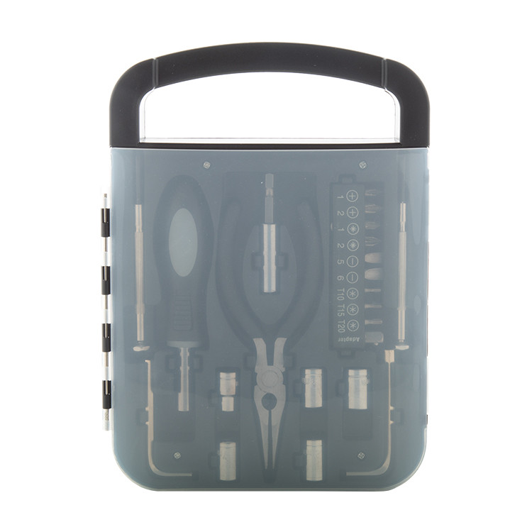 Сет метален алат од 22 парчиња во пластична кутија. Сетот вклучува 2 шрафцигера, 1 клешта, 1 рачка, 2 инбус клуча, 5 додатоци за одвртување шраф, 10 ситни додатоци.