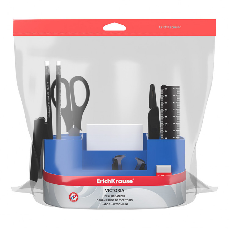Кутијата е изработена од висококвалитетна пластика. Сетот вклучува 14 артикли: 2 пенкала, 2 моливи, линеар, острилка, гума, штипки, хефталица №10, хефт иглици, дехефталици, ножици, скалпел, ливчиња за белешки.