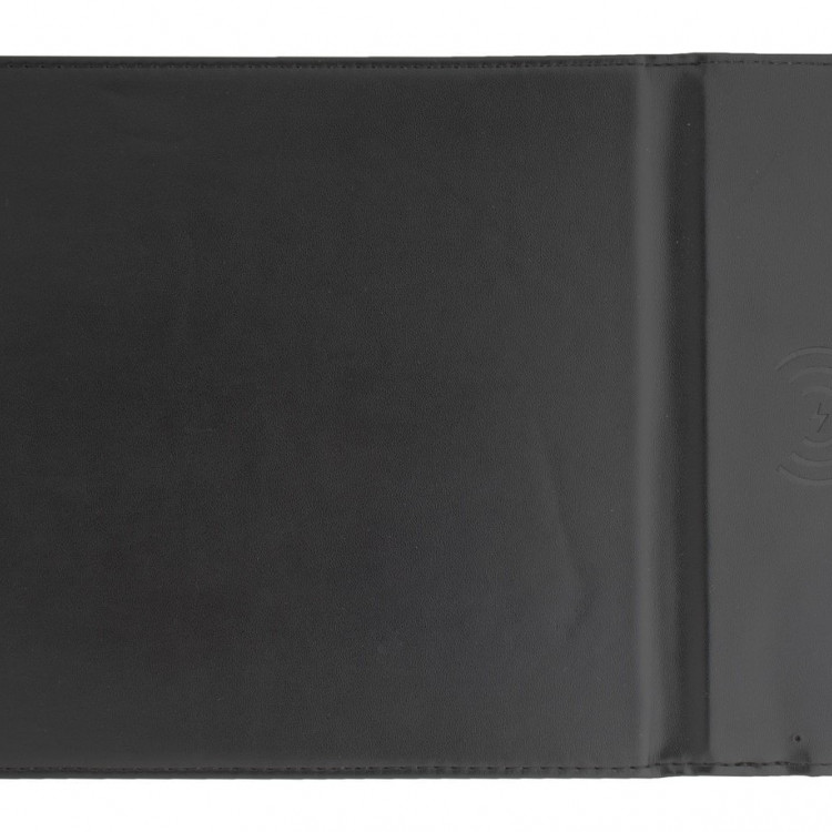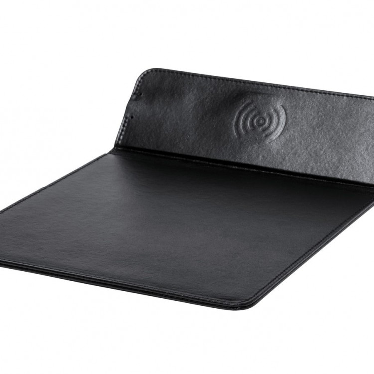 Маус пад од кожа со вграден безжичен полнач (5W) и функции за држач за мобилен телефон. Вклучува USB кабел за полнач.