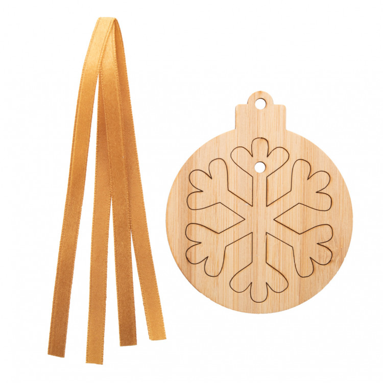 Новогодишни декорации во форма на снегулка 2 во 1 во бамбусова иверица со златни панделки. Се испорачува со одвоени ленти.