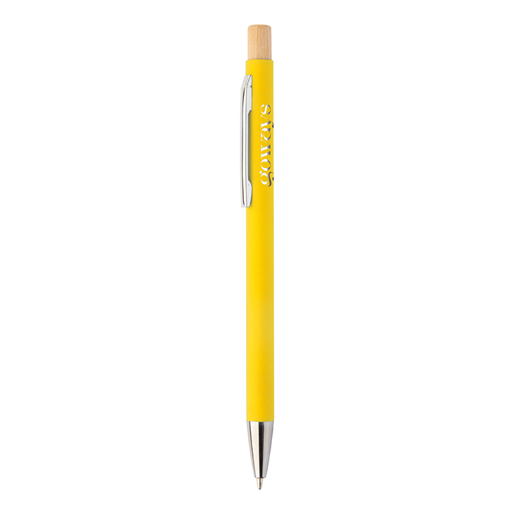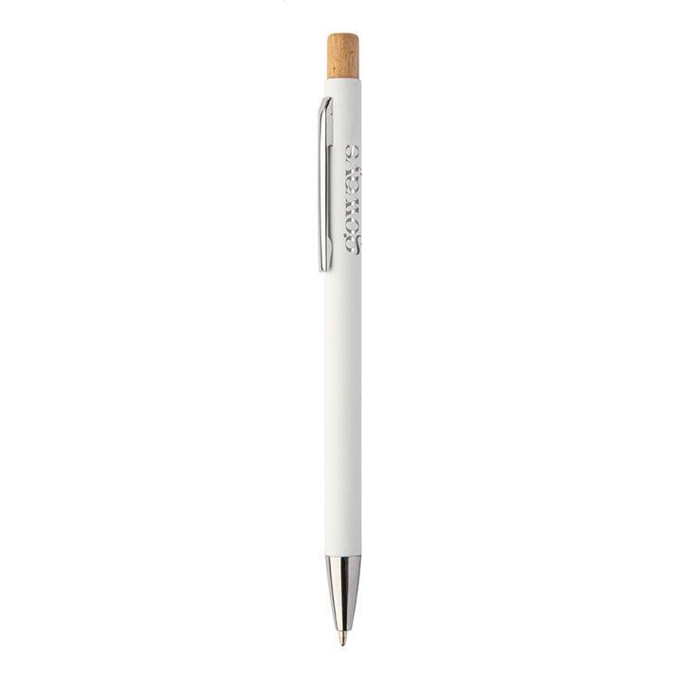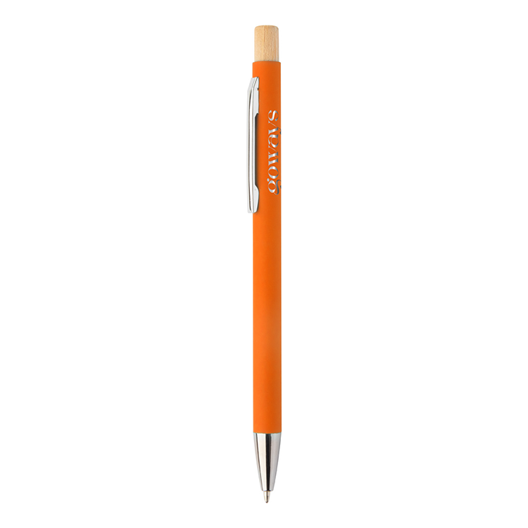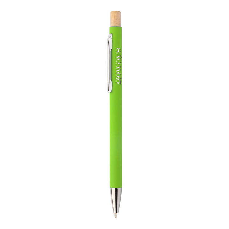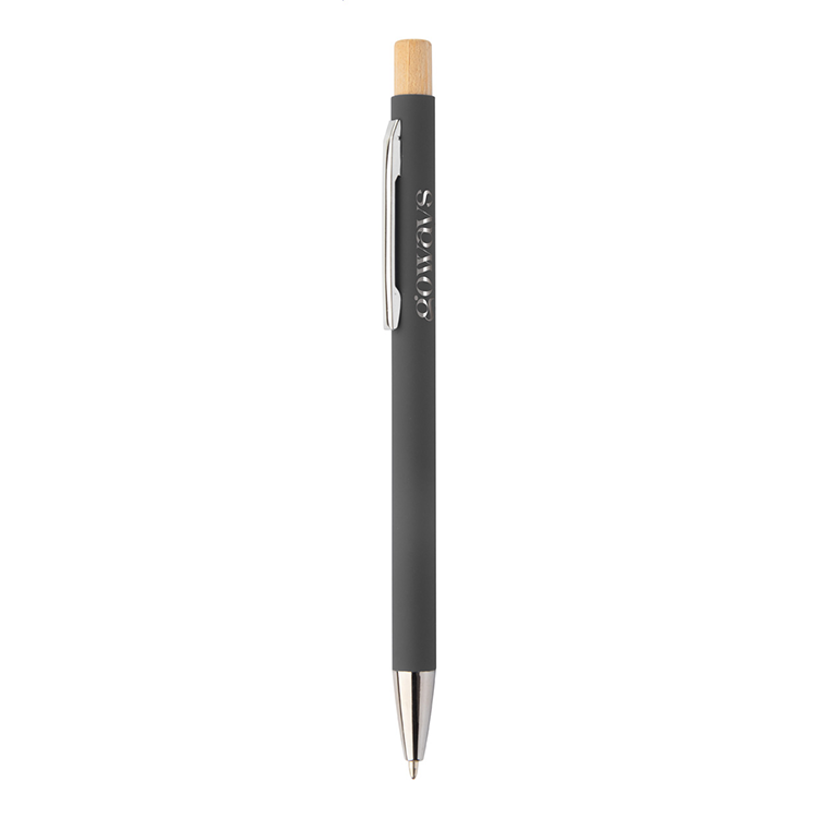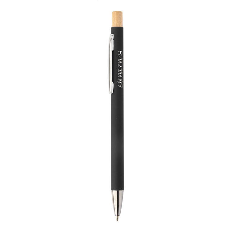 Нашето рециклирано алуминиумско пенкало со гумирана завршница, бамбус капаче и хромирани детали е идеално за оние што сакаат да комбинираат естетика со еко-свесност.