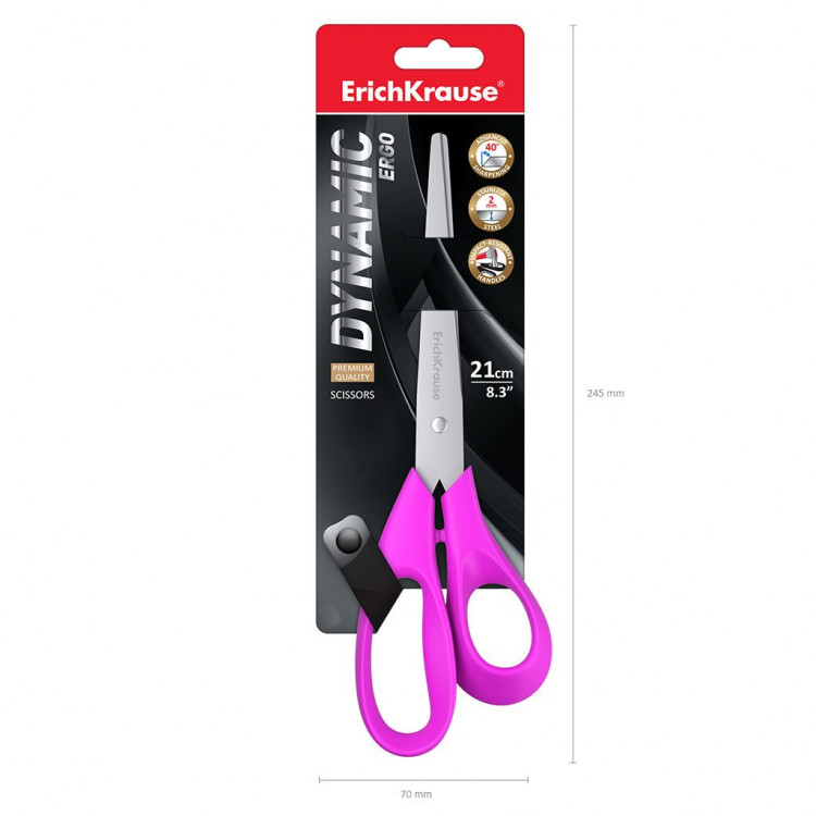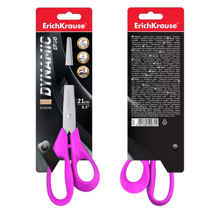 Ножици 21см Динамик Erich Krause се издржливи и ергономски ножици со остри сечила, идеални за канцелариска, училишна и домашна употреба.