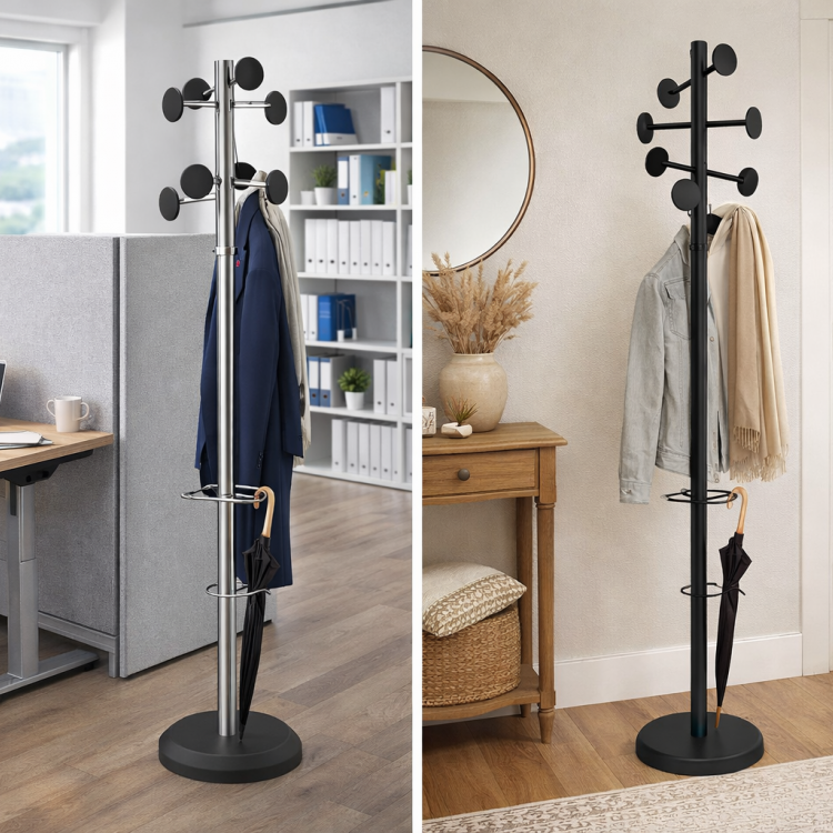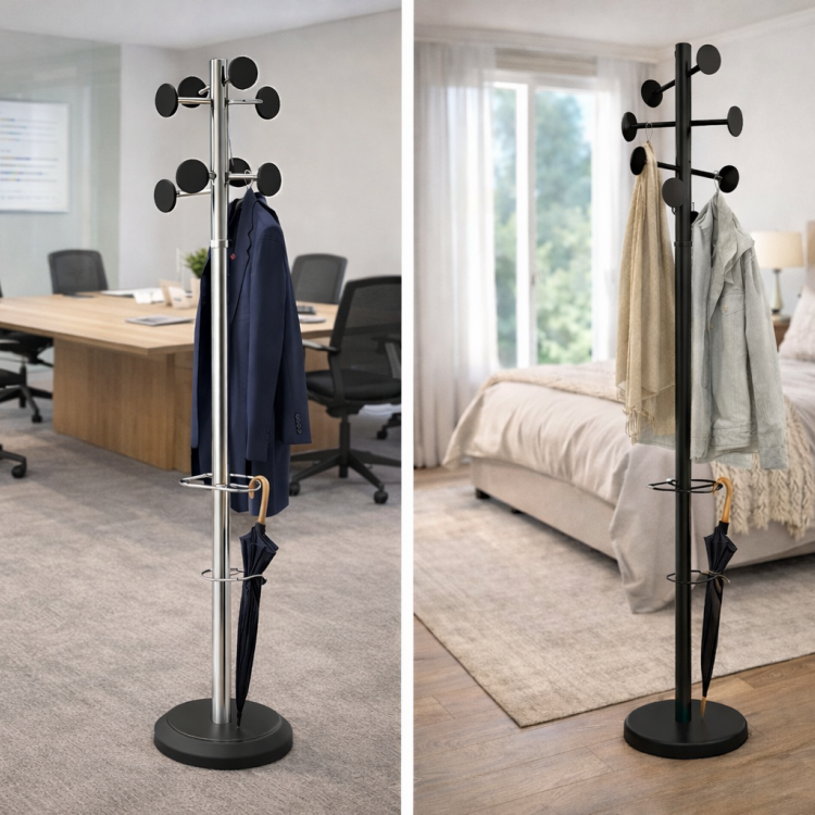 Пронајдете модерни и функционални закачалки за облека – метални стоечки закачалки за дом, канцеларија, ходник и влезни простори. Практични решенија за организирање на палта, јакни, чанти и чадори.