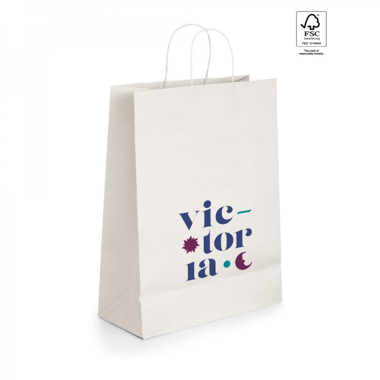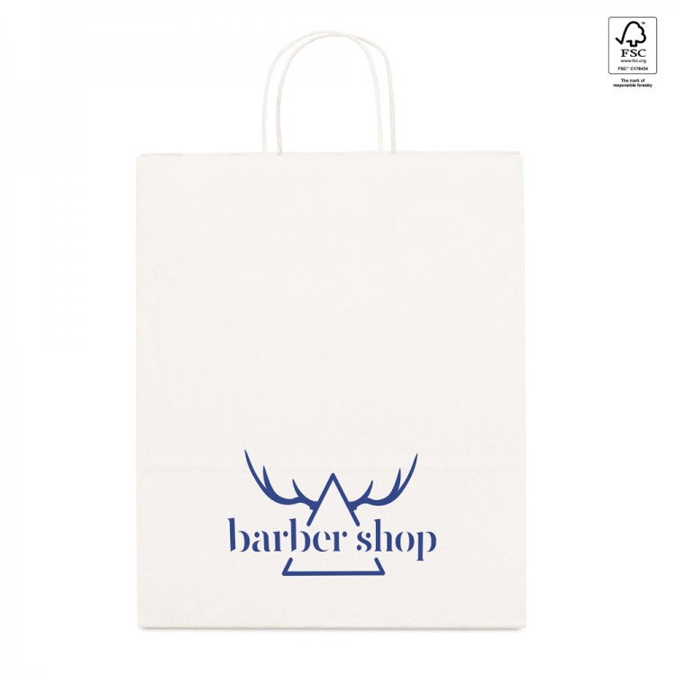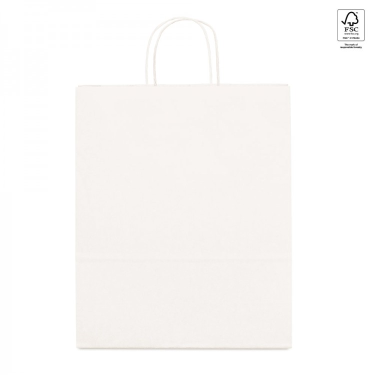 Бела хартиена кеса (100 g/m²) со бела рачка. Овој производ е изработен од сертифициран FSC™ сертифициран материјал.