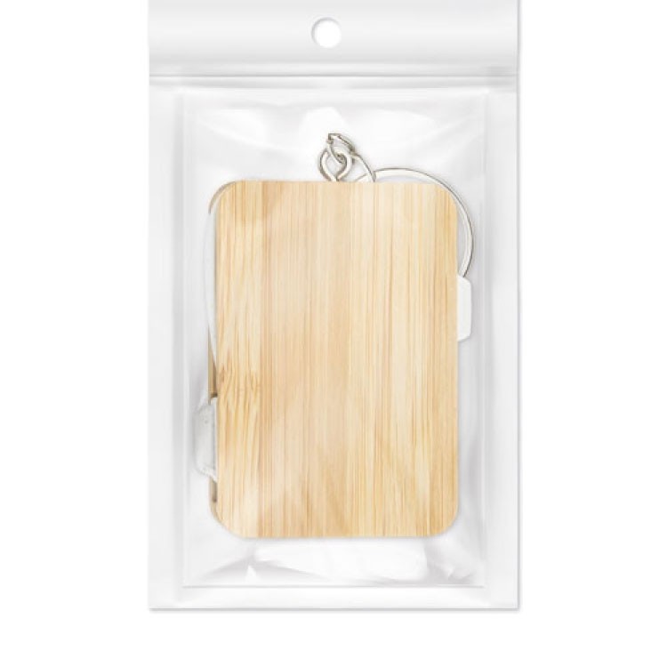 Стилен привезок од природен бамбус со вграден USB кабел и три конектори – micro-USB, USB-C и Lightning