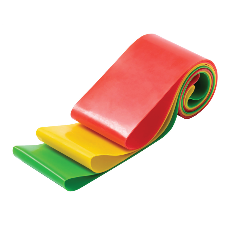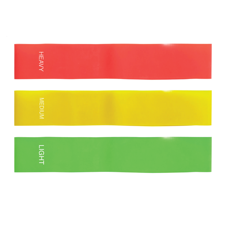 Комплет од три еластични ленти за вежбање изработени од TPE гума со различен степен на отпорност — лесна, средна и тешка.