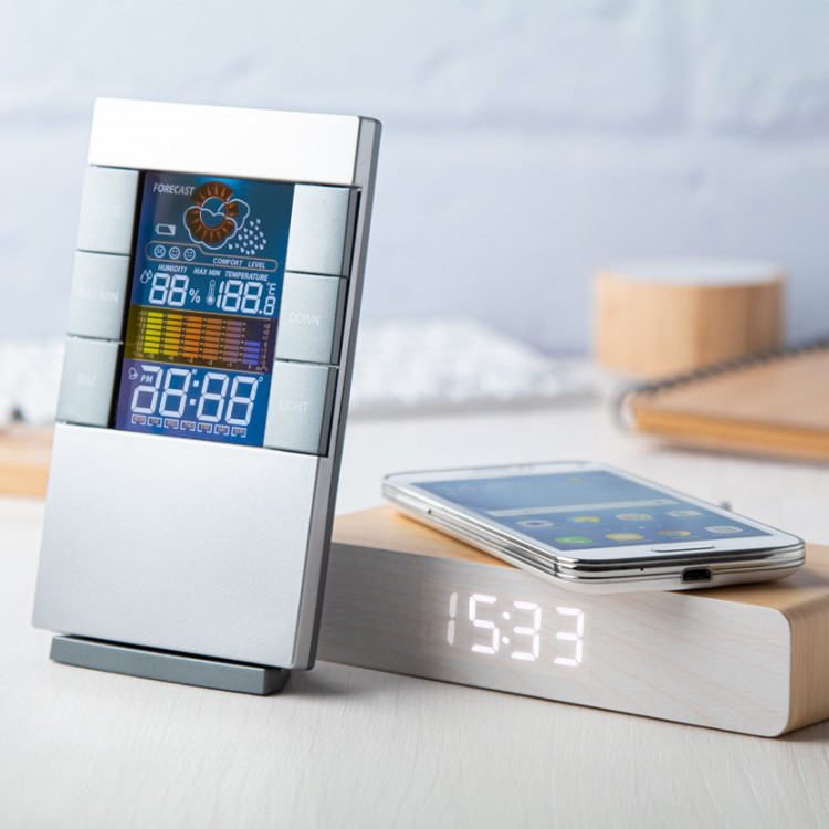 Часовник, термометар и календар за на маса во едно, практичен мултифункционален уред за организирање време и следење на услови во канцеларија или дома.